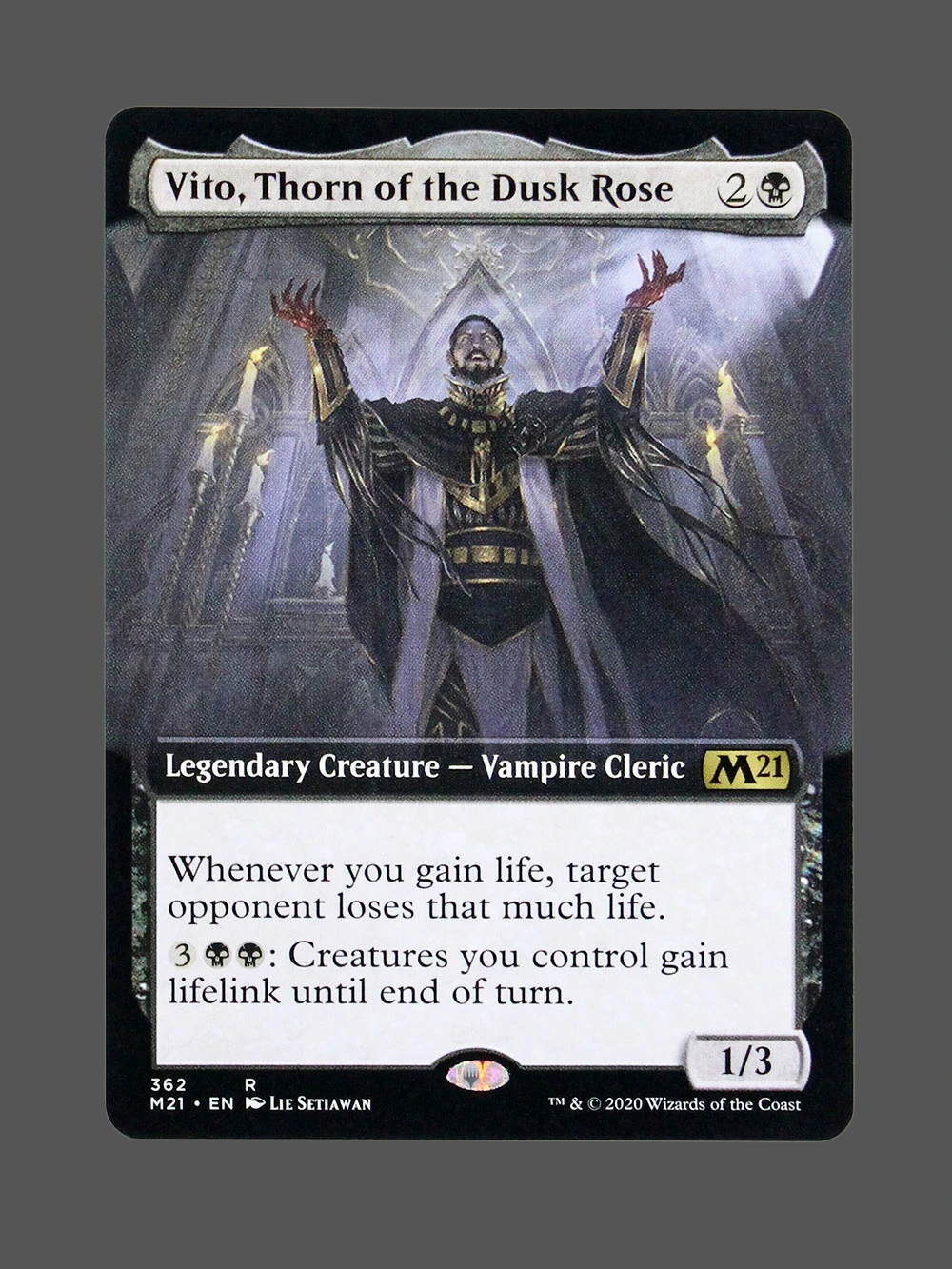 Looking for a high-quality Vito, Thorn of the Dusk Rose proxy? This Holo proxy from Core Set 2021 (M21) is a Legendary Creature — Vampire Cleric that punishes opponents when you gain life and grants lifelink to your creatures. Built with German black core paper and professional CMYK printing, it’s virtually indistinguishable from the original.