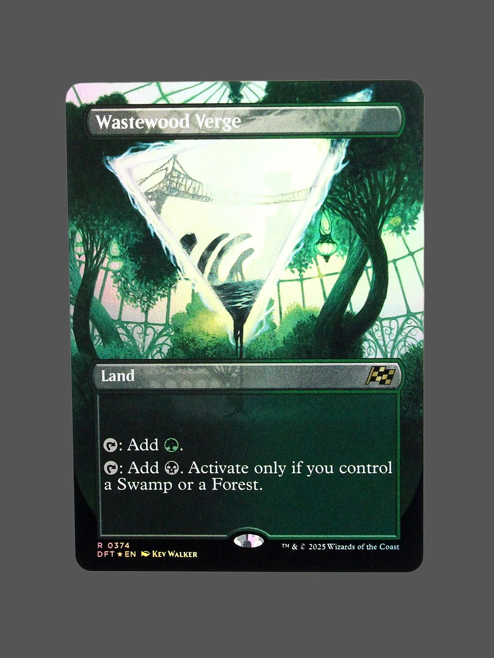 Looking for a high-quality Wastewood Verge proxy? This Foil proxy from Duskmourn: House of Horror (DFT) is a Land that adds one green mana and can tap to add black mana if you control a Swamp or Forest. Built with German black core paper and professional CMYK printing, it’s virtually indistinguishable from the original.