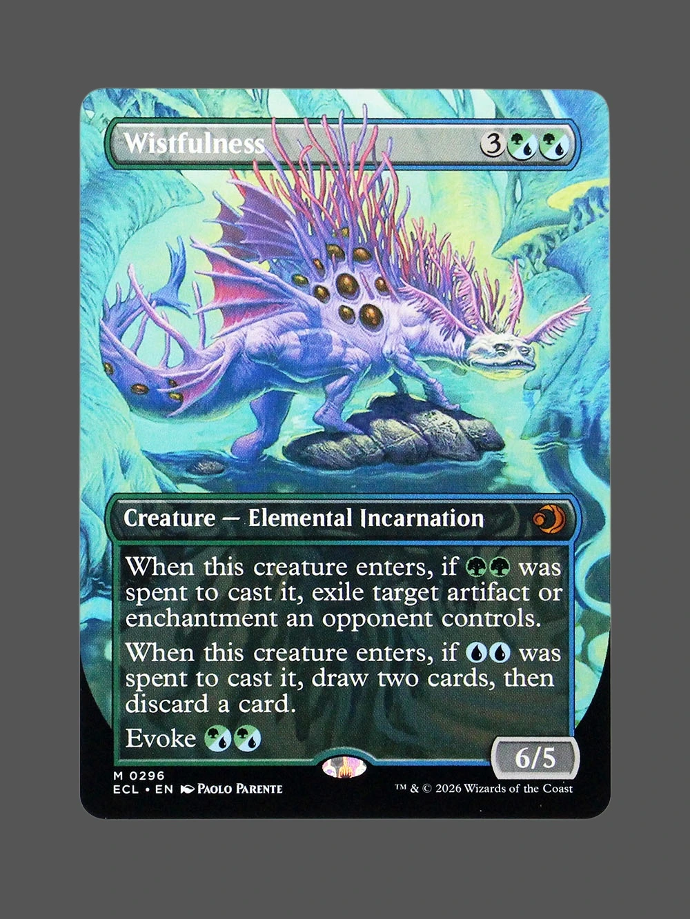 Looking for a high-quality Wistfulness proxy? This Holo proxy from Eldritch Moon (ECL) is a Creature — Elemental Incarnation that exiles an artifact or enchantment when cast with green mana, or draws two cards and discards one when cast with blue mana. Built with German black core paper and professional CMYK printing, it’s virtually indistinguishable from the original.
